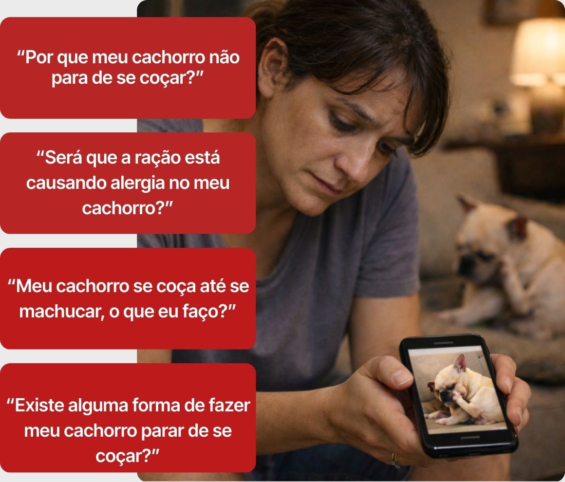 Continuar sofrendo ao ver o seu cachorro se coçar todos dias, trocando de ração sem saber o que realmente está causando alergia, gastando rios de dinheiro com tratamentos que apenas aliviam o problema, enquanto a coceira, a inflamação na pele e o desconforto continuam fazendo parte da rotina do seu cão.