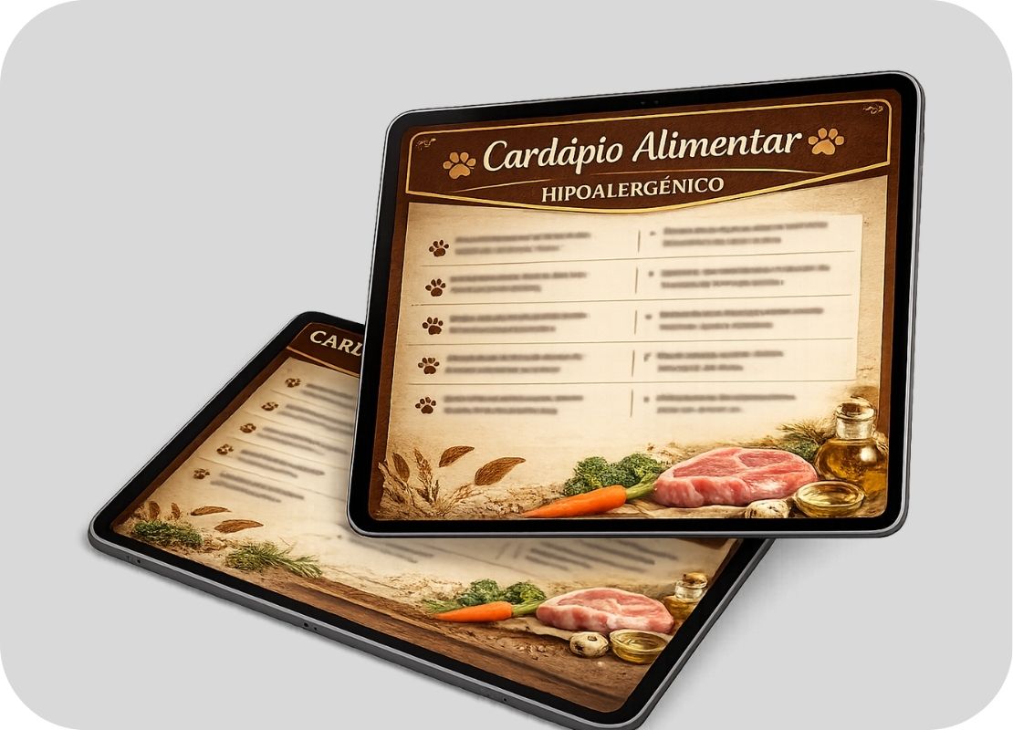 Você terá acesso a 4 cardápios completos e balanceados, desenvolvido para cães com alergia. Assim você poderá alimentar o seu cão com segurança, evitando ingredientes que provocam coceira.