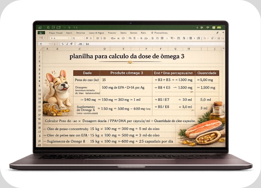 Uma planilha simples que ajuda você a calcular a dose correta de ômega 3 de acordo com o peso do seu cão. Além disso, você também receberá a indicação das principais marcas confiáveis do mercado.